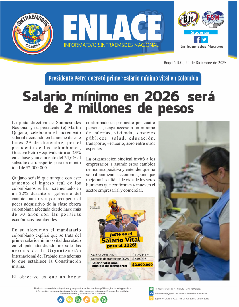 La junta directiva de Sintraesmdes Nacional y su presidente (e) Martín Quijano, celebraron el incremento salarial decretado en la noche de este lunes 29 de diciembre, por el presidente de los colombianos, Gustavo Petro y equivalente a un 23% en la base y un aumento del 24,6% al subsidio de transporte, para un monto total de $2.000.000.