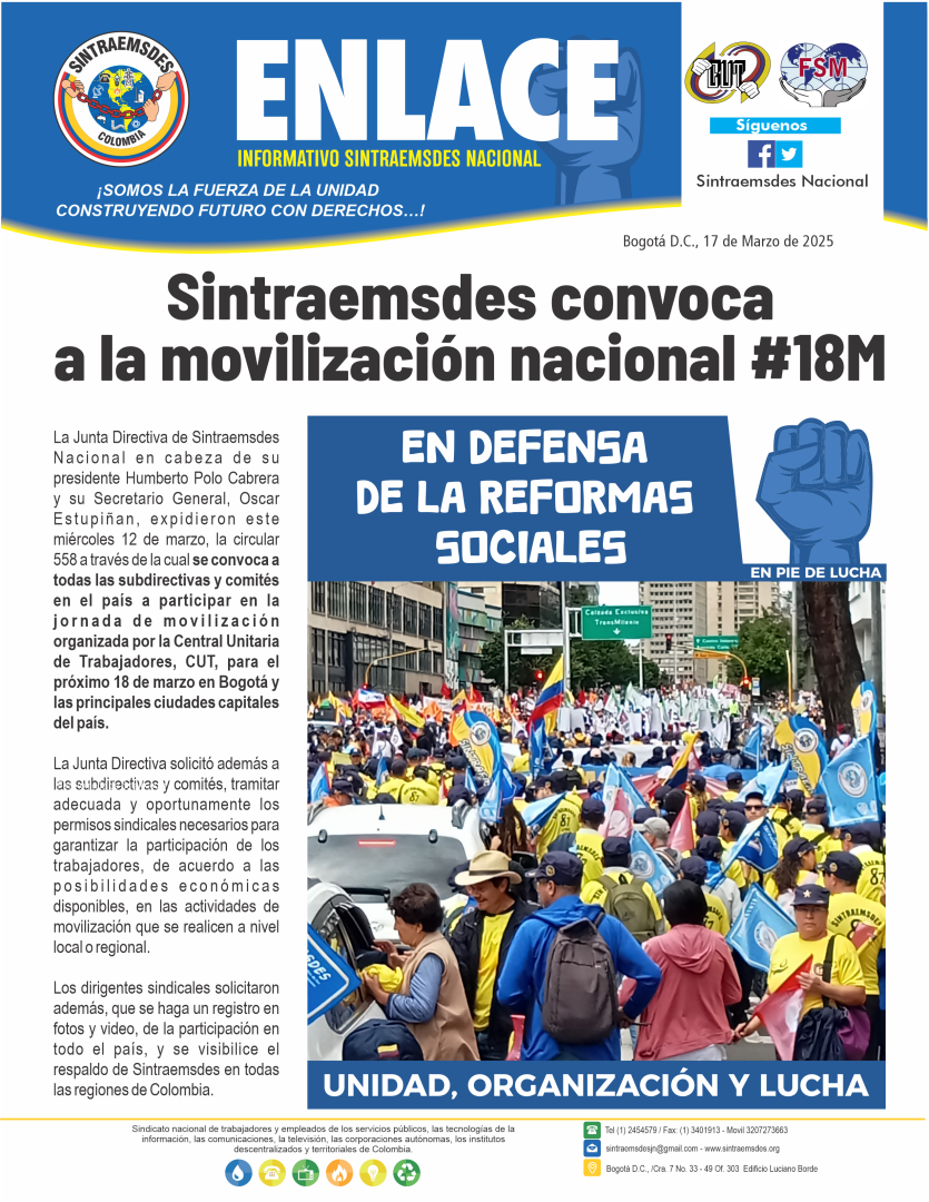La Junta Directiva de Sintraemsdes Nacional en cabeza de su presidente Humberto Polo Cabrera y su Secretario General, Oscar Estupiñan, expidieron este miércoles 12 de marzo, la circular 558 a través de la cual se convoca a todas las subdirectivas y comités en el país a participar en la jornada de movilización organizada por la Central Unitaria de Trabajadores, CUT, para el próximo 18 de marzo en Bogotá y las principales ciudades capitales del país.