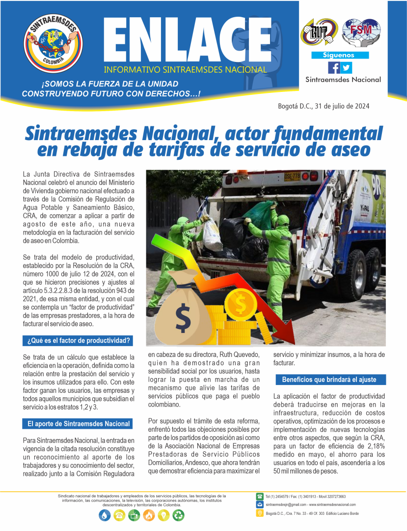 La Junta Directiva de Sintraemsdes Nacional celebró el anuncio del Ministerio de Vivienda gobierno nacional efectuado a través de la Comisión de Regulación de Agua Potable y Saneamiento Básico, CRA, de comenzar a aplicar a partir de agosto de este año, una nueva metodología en la facturación del servicio de aseo en Colombia.
