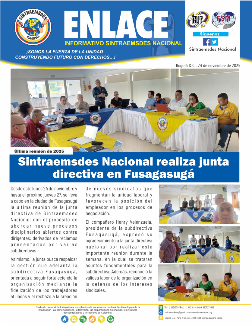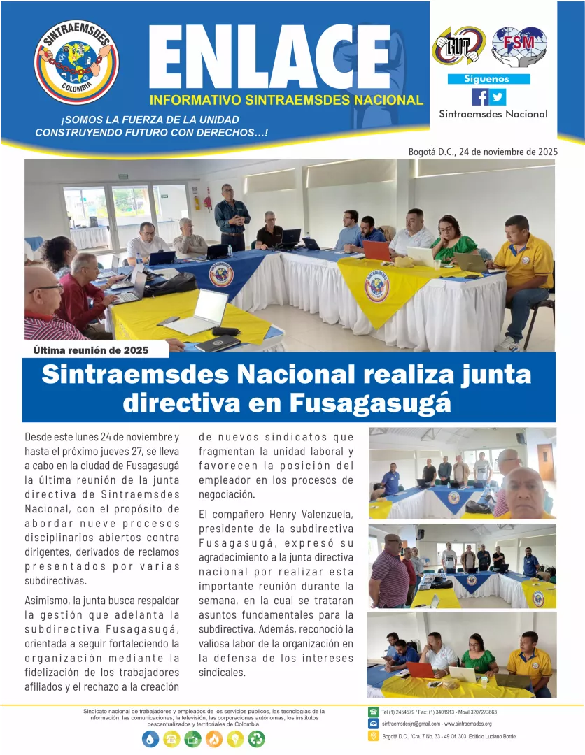 Desde este lunes 24 de noviembre y hasta el próximo jueves 27, se lleva a cabo en la ciudad de Fusagasugá la última reunión de la junta directiva de Sintraemsdes Nacional, con el propósito de abordar nueve procesos disciplinarios abiertos contra dirigentes, derivados de reclamos presentados por varias subdirectivas.