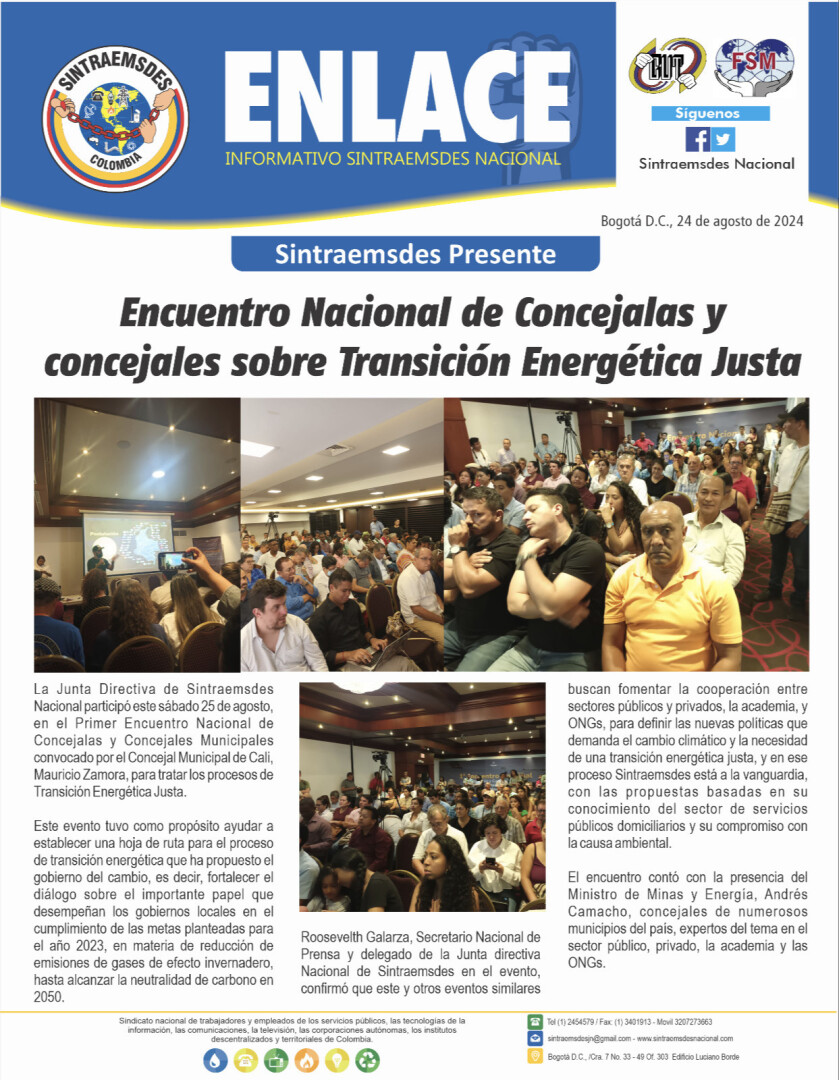 La Junta Directiva de Sintraemsdes Nacional participó este sábado 25 de agosto, en el Primer Encuentro Nacional de Concejalas y Concejales Municipales convocado por el Concejal Municipal de Cali, Mauricio Zamora, para tratar los procesos de Transición Energética Justa.