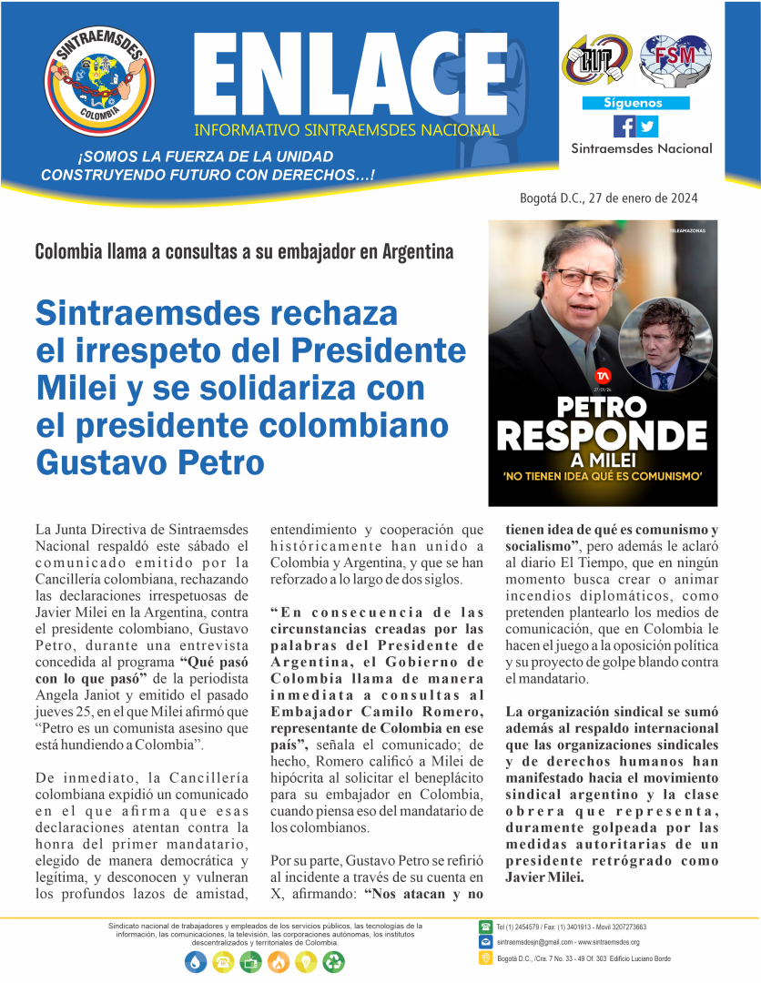 La Junta Directiva de Sintraemsdes Nacional respaldó este sábado el comunicado emitido por la Cancillería colombiana, rechazando las declaraciones irrespetuosas de Javier Milei en la Argentina, contra el presidente colombiano, Gustavo Petro, durante una entrevista concedida al programa “Qué pasó con lo que pasó” de la periodista Angela Janiot y emitido el pasado jueves 25, en el que Milei afirmó que “Petro es un comunista asesino que está hundiendo a Colombia”.