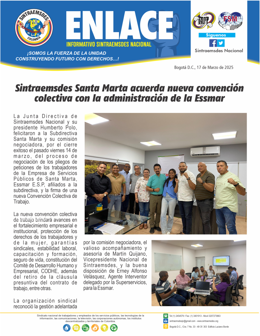 La Junta Directiva de Sintraemsdes Nacional y su presidente Humberto Polo, felicitaron a la Subdirectiva Santa Marta y su comisión negociadora, por el cierre exitoso el pasado viernes 14 de marzo, del proceso de negociación de los pliegos de peticiones de los trabajadores de la Empresa de Servicios Públicos de Santa Marta, Essmar E.S.P, afiliados a la subdirectiva, y la firma de una nueva Convención Colectiva de Trabajo.