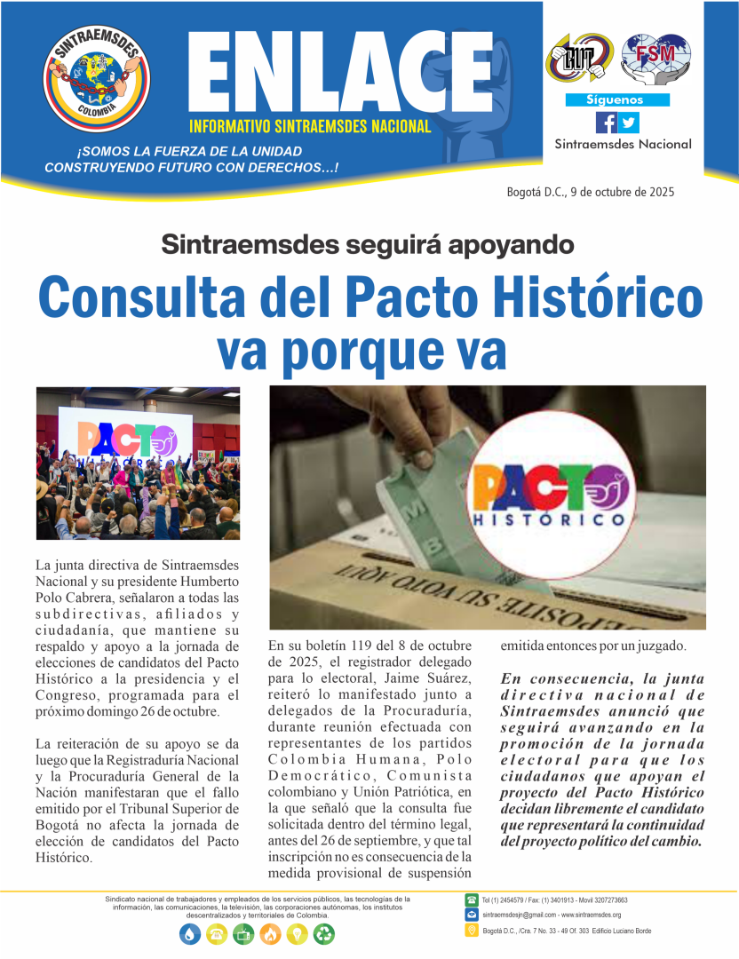 La junta directiva de Sintraemsdes Nacional y su presidente Humberto Polo Cabrera, señalaron a todas las subdirectivas, afiliados y ciudadanía, que mantiene su respaldo y apoyo a la jornada de elecciones de candidatos del Pacto Histórico a la presidencia y el Congreso, programada para el próximo domingo 26 de octubre.