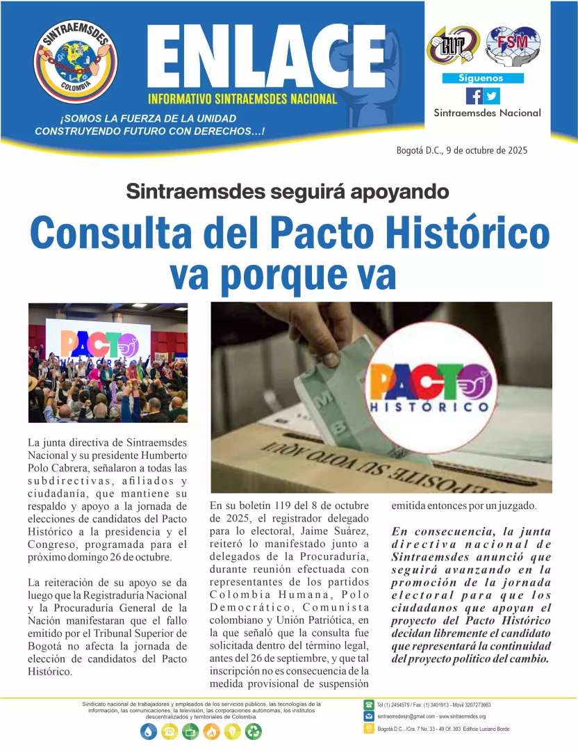 En consecuencia, la junta directiva nacional de Sintraemsdes anunció que seguirá avanzando en la promoción de la jornada electoral para que los ciudadanos que apoyan el proyecto del Pacto Histórico decidan libremente el candidato que representará la continuidad del proyecto político del cambio.