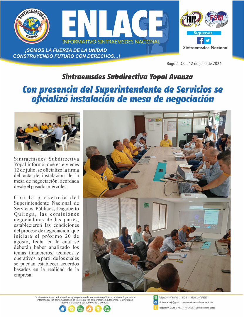 Sintraemsdes Subdirectiva Yopal informó, que este vienes 12 de julio, se oficializó la firma del acta de instalación de la mesa de negociación, acordada desde el pasado miércoles.