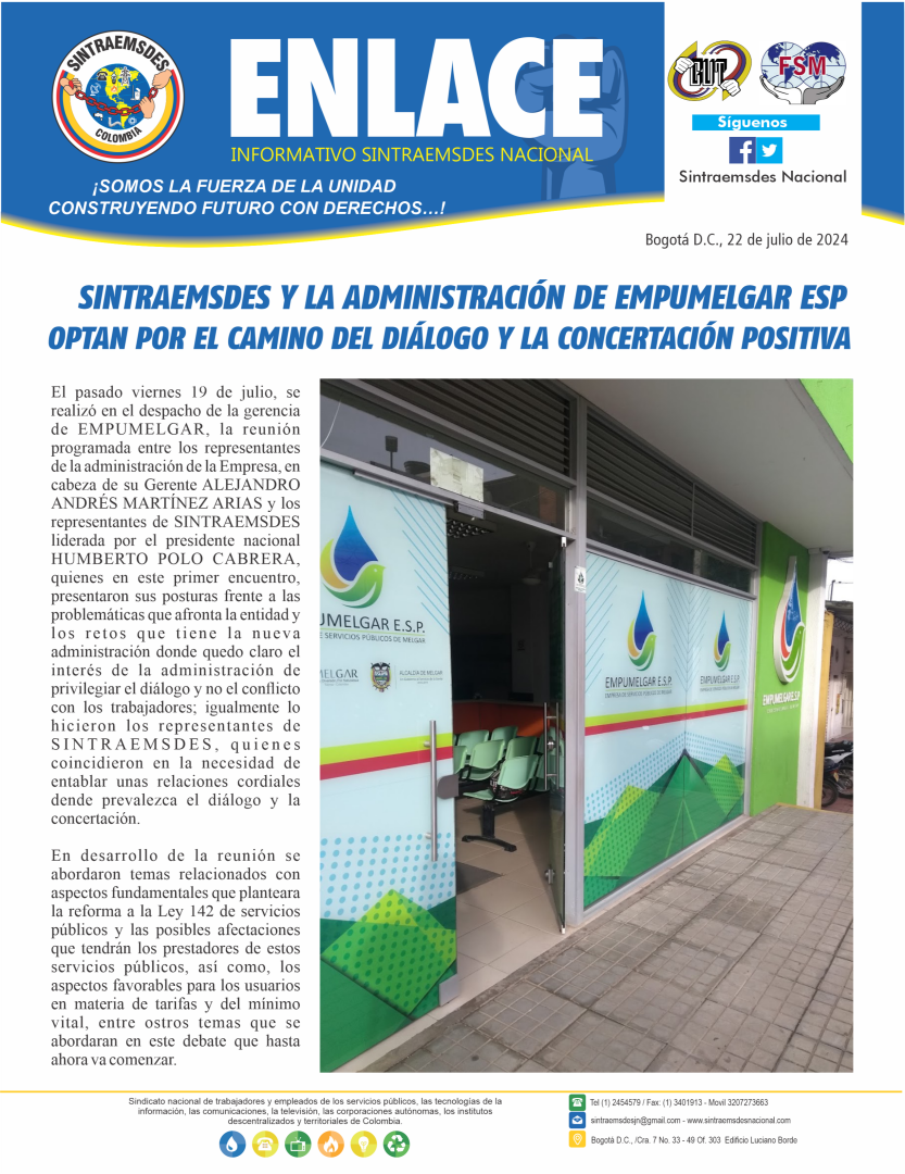 El pasado viernes 19 de julio, se realizó en el despacho de la gerencia de EMPUMELGAR, la reunión programada entre los representantes de la administración de la Empresa, en cabeza de su Gerente ALEJANDRO ANDRÉS MARTÍNEZ ARIAS y los representantes de SINTRAEMSDES liderada por el presidente nacional HUMBERTO POLO CABRERA, quienes en este primer encuentro, presentaron sus posturas frente a las problemáticas que afronta la entidad y los retos que tiene la nueva administración donde quedo claro el interés de la administración de privilegiar el diálogo y no el conflicto con los trabajadores; igualmente lo hicieron los representantes de SINTRAEMSDES, quienes coincidieron en la necesidad de entablar unas relaciones cordiales dende prevalezca el dialogo y la concertación.