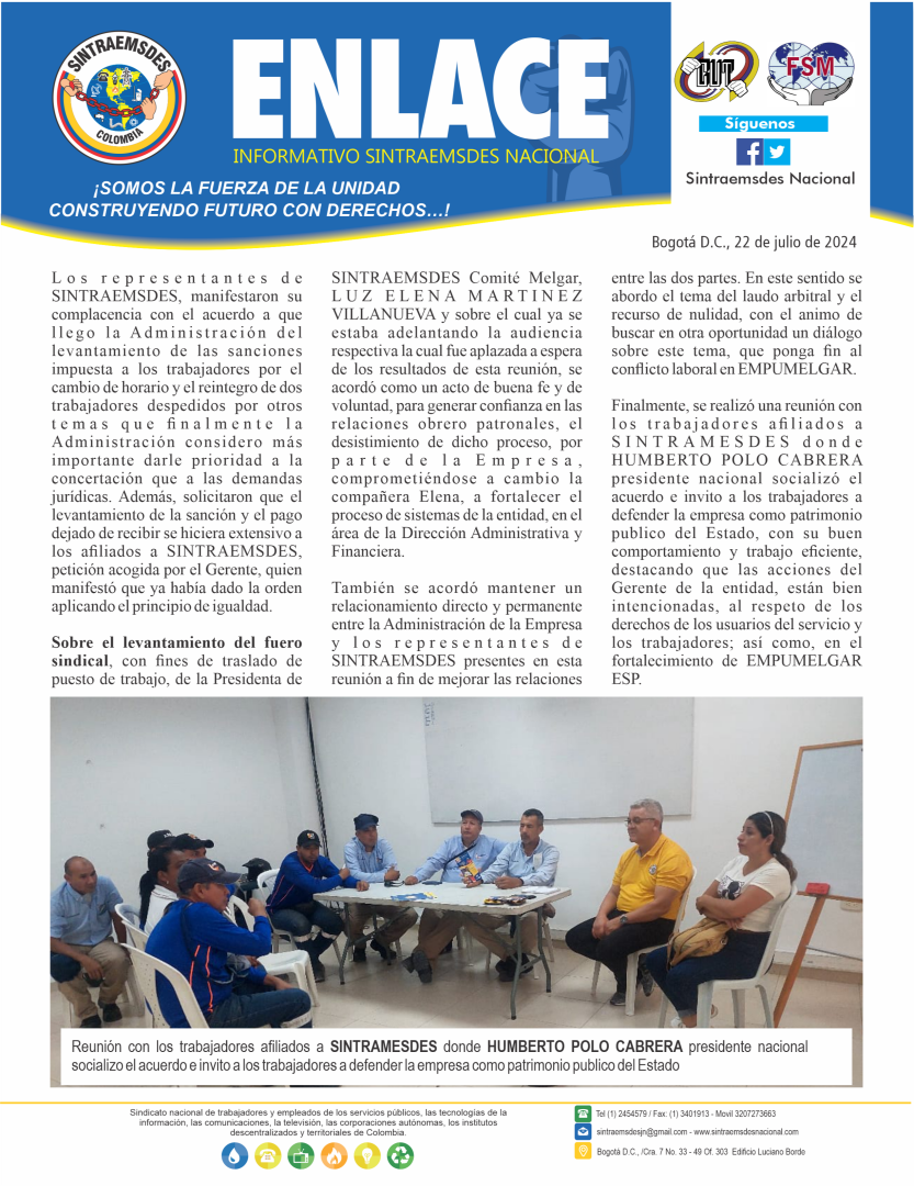 Finalmente, se realizo una reunión con los trabajadores afiliados a SINTRAMESDES donde HUMBERTO POLO CABRERA presidente nacional socializo el acuerdo e invito a los trabajadores a defender la empresa como patrimonio publico del Estado, con su buen comportamiento y trabajo eficiente, destacando que las acciones del Gerente de la entidad, están bien intencionadas, al respeto de los derechos de los usuarios del servicio y los trabajadores; así como, en el fortalecimiento de EMPUMELGAR ESP.